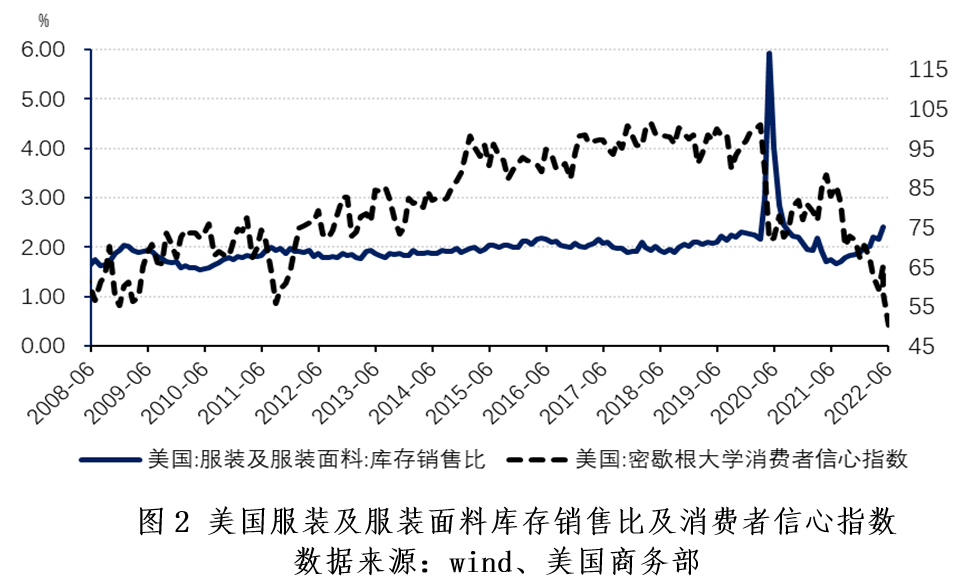 據(jù)美國商務(wù)部數(shù)據(jù)顯示,美國服裝庫存銷售比自2021年6月觸底,2021年7月-2022年4月持續(xù)10個月上升至2.42%,達(dá)到1992年有記錄以來最高水平(除去2020年疫情特殊年份)。媒體稱,眼下梅西百貨倉庫中堆滿運(yùn)動衣、休閑服,美國沃爾瑪?shù)膸齑嬖?季度增加約33%,截止4月末,Gap品牌庫存同比增加34%,AmericanEagle庫存同比增長46%。預(yù)計(jì)后續(xù)美國服裝訂單將明顯減少。原因一是前期擔(dān)心物流受阻超量預(yù)定的訂單難以消化,二是消費(fèi)者信心跌入低谷,密歇根消費(fèi)者信心指數(shù)從2021年4月開始下滑,至2022年6月跌至歷史最低水平,跌破1980年低位。