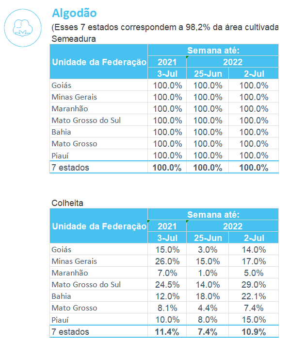 據(jù)巴西農(nóng)業(yè)部下屬的國家商品供應(yīng)公司CONAB,截至7月2日,巴西棉花收割率為10.9%,上周為7.4%,去年同期為11.4%。