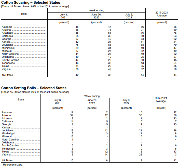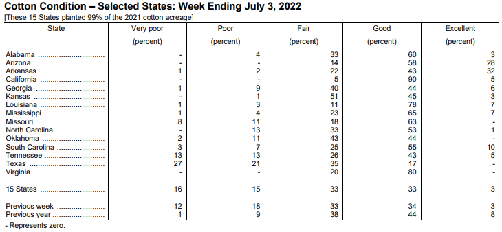 美國農業(yè)部7月5日發(fā)布的美國棉花生長報告顯示,截至7月3日當周,美棉現蕾率為44%,前周為33%,去年同期為42%,五年均值為44%。美棉結鈴率為13%,前周為8%,去年同期為10%,五年均值為12%,美棉生長優(yōu)良率為36%,前周為37%,去年同期為52%。