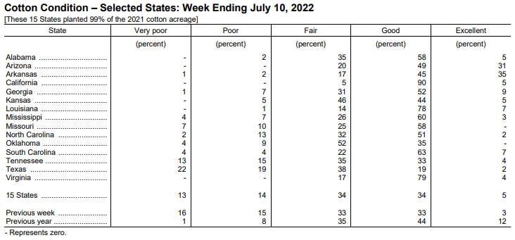 美國農(nóng)業(yè)部7月11日發(fā)布的美國棉花生長報告顯示,截至7月10日當周,美棉現(xiàn)蕾率為57%,前周為44%,去年同期為53%,五年均值為58%。美棉結(jié)鈴率為22%,前周為13%,去年同期為15%,五年均值為18%,美棉生長優(yōu)良率為39%,前周為36%,去年同期為56%。