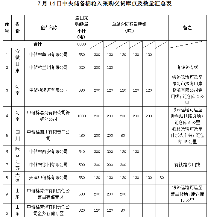 中國(guó)儲(chǔ)備棉管理有限公司定于2022年7月14日采購棉花6000噸(公定重量)。具體庫點(diǎn)及數(shù)量如下: