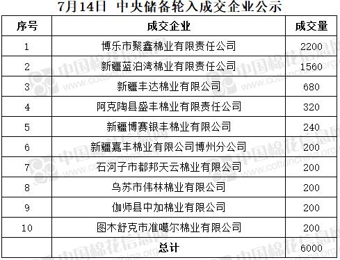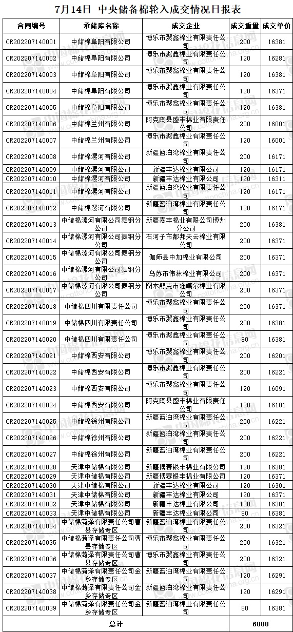7月14日,中國(guó)儲(chǔ)備棉管理有限公司掛牌采購(gòu)棉花6000噸(公定重量),實(shí)際成交6000噸,成交率100%,成交均價(jià)16286元/噸,成交最高價(jià)16381元/噸,成交最低價(jià)16001元/噸。