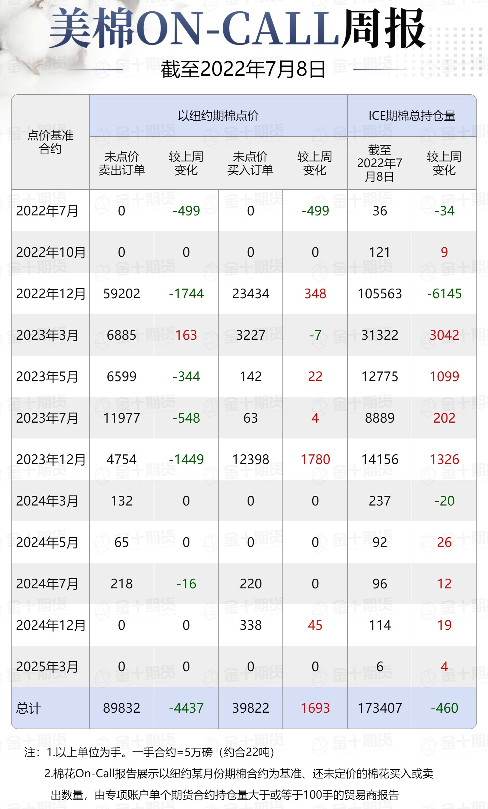 據(jù)美國商品期貨交易委員會(CFTC)最新數(shù)據(jù),截至7月8日,①美棉On-Call未點價賣出訂單89832手,環(huán)比減少4437手;未點價買入訂單39822手,環(huán)比增加1693手;②ICE期棉2207合約上賣方未點價合約為0手,較此前一周減少499手;③ICE棉花期貨盤面2021/22年度(8月至次年7月)的On-Call合約未點價賣出訂單為0手,環(huán)比減少499手。