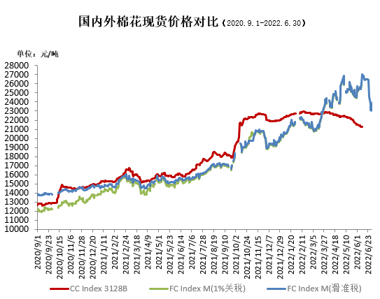 6月,美聯(lián)儲大幅度加息引發(fā)大經(jīng)濟(jì)衰退的擔(dān)憂,能源和谷物等在內(nèi)的大宗商品價(jià)格均大幅走弱,受此影響,國際棉價(jià)承壓下行,但跌幅相對較小。中國進(jìn)口棉價(jià)格指數(shù)FCIndexM月均154.95美分/磅,環(huán)比下跌6.79美分;月底143.12美分/磅,環(huán)比下跌12.86美分,1%關(guān)稅下折人民幣23619元/噸,高于同期國內(nèi)現(xiàn)貨5250元,內(nèi)外棉價(jià)價(jià)差繼續(xù)大幅擴(kuò)大。