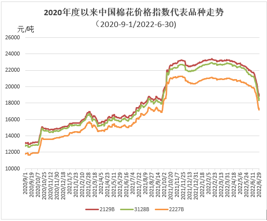 6月,國內(nèi)棉花市場延續(xù)弱勢,前半月棉價(jià)緩慢走低,后半月加速下跌,28日以18325元/噸創(chuàng)今年以來最低。隨著“雙結(jié)零”日期的臨近,棉企還貸壓力加大,多降價(jià)促銷;紡織廠淡季持續(xù),開機(jī)率不足,下游訂單減弱,皮棉需求以剛需為主,隨用隨買,整體購銷進(jìn)度持續(xù)緩慢。月末,中國棉花價(jià)格指數(shù)(CCIndex3128B)18369元/噸,環(huán)比下跌3150元;月均價(jià)20402元/噸,環(huán)比下跌1720元,同比上漲4417元。