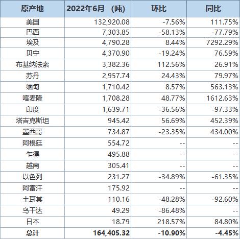 據(jù)海關(guān)統(tǒng)計(jì)數(shù)據(jù),2022年6月我國進(jìn)口棉花約16萬噸,環(huán)比減少約2萬噸,同比增長約4.4%。