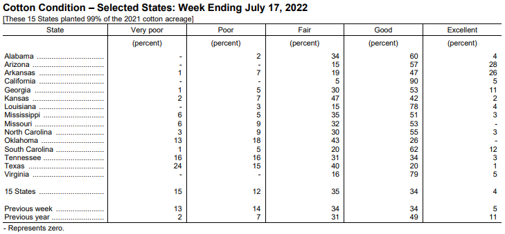 美國農(nóng)業(yè)部7月18日發(fā)布的美國棉花生長報告顯示,截至7月17日當周,美棉現(xiàn)蕾率為74%,前周為57%,去年同期為67%,五年均值為70%。美棉結(jié)鈴率為31%,前周為22%,去年同期為22%,五年均值為27%,美棉生長優(yōu)良率為38%,前周為39%,去年同期為60%。