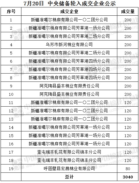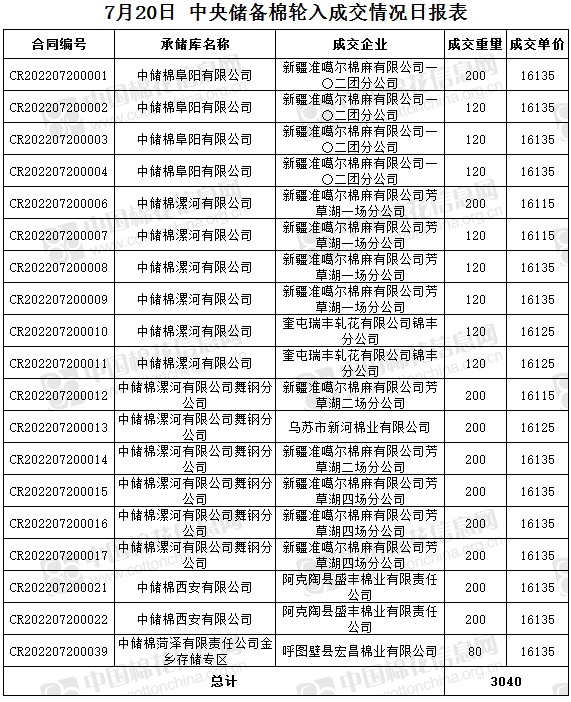 7月20日,中國儲備棉管理有限公司掛牌采購棉花6000噸(公定重量),實際成交3040噸,成交率51%,成交均價16130元/噸,成交最高價16135元/噸,成交最低價16115元/噸。