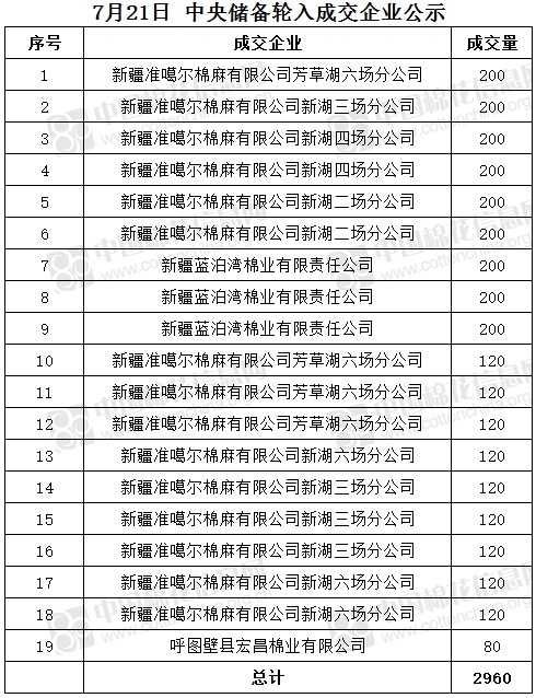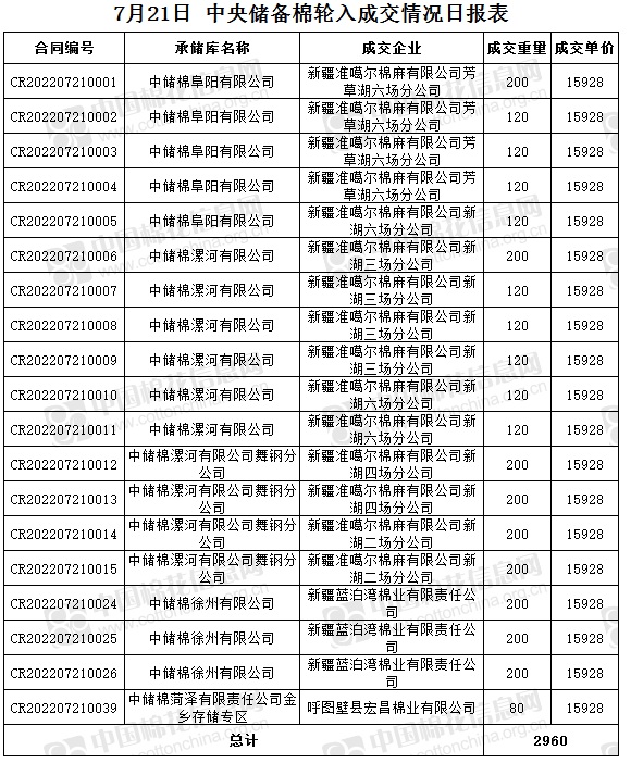 7月21日,中國(guó)儲(chǔ)備棉管理有限公司掛牌采購(gòu)棉花6000噸(公定重量),實(shí)際成交2960噸,成交率49%,成交均價(jià)15928元/噸,成交最高價(jià)15928元/噸,成交最低價(jià)15928元/噸。