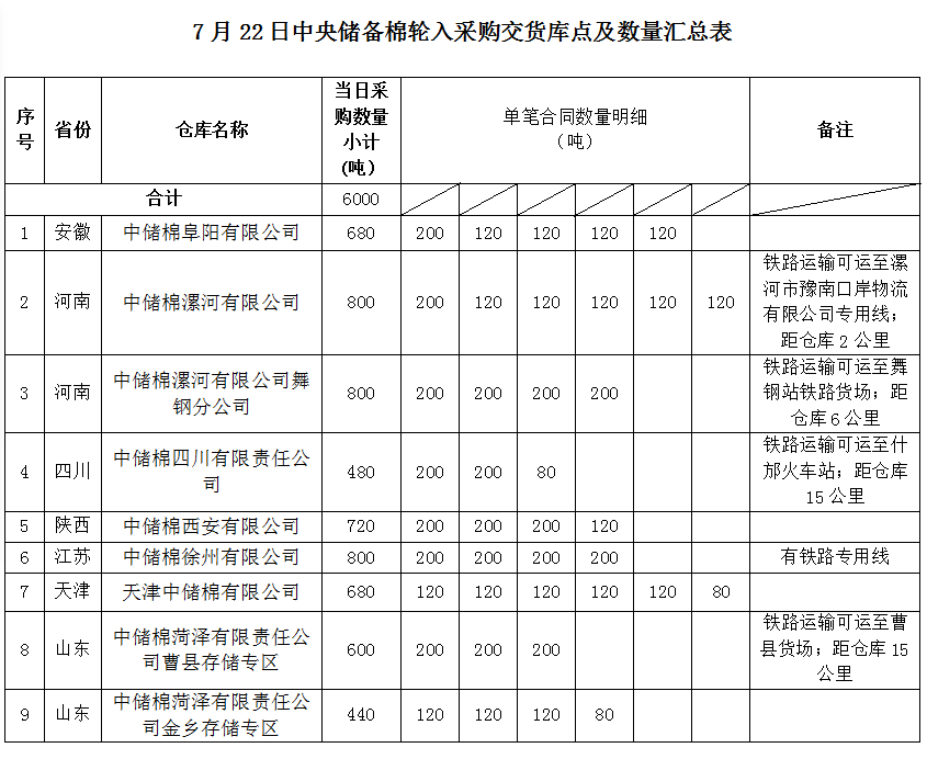 中國(guó)儲(chǔ)備棉管理有限公司定于2022年7月22日采購(gòu)棉花6000噸(公定重量)。具體庫(kù)點(diǎn)及數(shù)量如下: