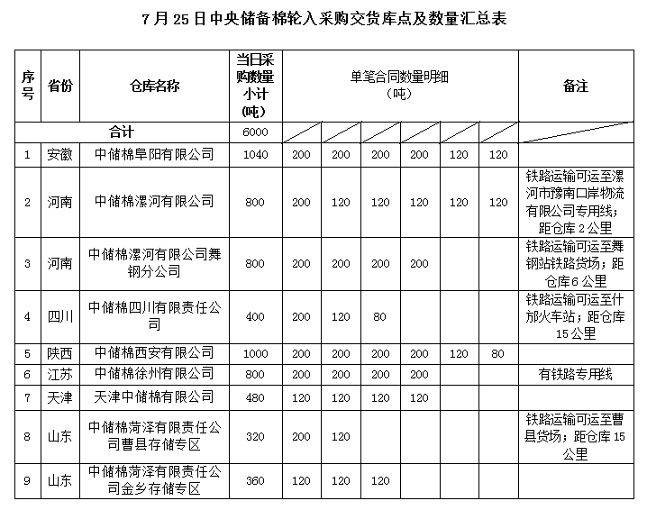 中國儲備棉管理有限公司定于2022年7月25日采購棉花6000噸(公定重量)。具體庫點及數量如下: