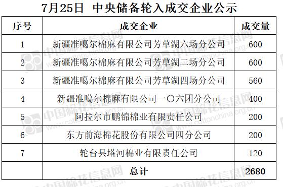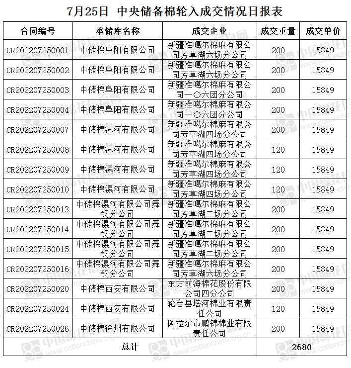 7月25日,中國儲(chǔ)備棉管理有限公司掛牌采購棉花6000噸(公定重量),實(shí)際成交2680噸,成交率45%,成交均價(jià)15849元/噸,成交最高價(jià)15849元/噸,成交最低價(jià)15849元/噸。