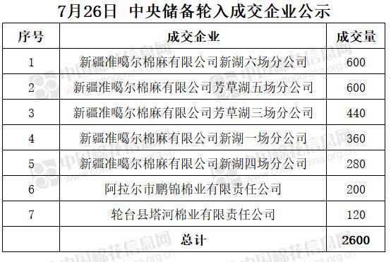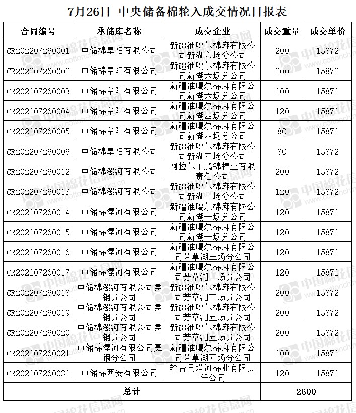 7月26日,中國儲(chǔ)備棉管理有限公司掛牌采購棉花6000噸(公定重量),實(shí)際成交2600噸,成交率43%,成交均價(jià)15872元/噸,成交最高價(jià)15872元/噸,成交最低價(jià)15872元/噸。