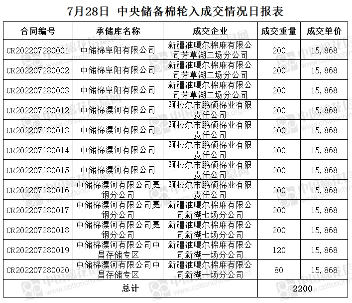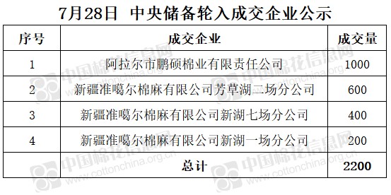 7月28日,中國儲備棉管理有限公司掛牌采購棉花6000噸(公定重量),實際成交2200噸,成交率37%,成交均價15868元/噸,成交最高價15868元/噸,成交最低價15868元/噸。