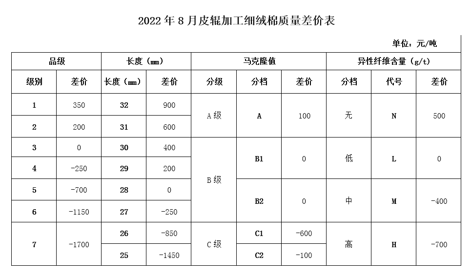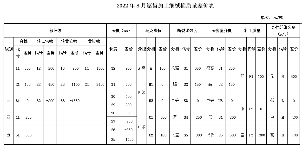 根據(jù)《中國棉花協(xié)會(huì)國產(chǎn)棉質(zhì)量差價(jià)表管理辦法》規(guī)定,現(xiàn)正式發(fā)布2022年8月《鋸齒加工細(xì)絨棉質(zhì)量差價(jià)表》、《皮輥加工細(xì)絨棉質(zhì)量差價(jià)表》和《長絨棉質(zhì)量差價(jià)表》(單位:元/噸)。