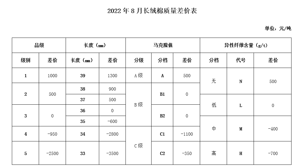 依據(jù)2022年7月的棉花公檢質(zhì)量數(shù)據(jù)、中國棉花協(xié)會(huì)棉花質(zhì)量價(jià)差自動(dòng)生成系統(tǒng)采集的棉花加工企業(yè)銷售成交價(jià)、紡織企業(yè)監(jiān)測點(diǎn)的采集數(shù)據(jù)以及當(dāng)月的中國棉花價(jià)格指數(shù),并征求業(yè)內(nèi)相關(guān)專家的意見,與上月相比,《鋸齒加工細(xì)絨棉質(zhì)量差價(jià)表》、《皮輥加工細(xì)絨棉質(zhì)量差價(jià)表》、《長絨棉質(zhì)量差價(jià)表》保持不變。