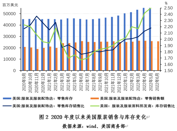 美國(guó)服裝進(jìn)入去庫(kù)存階段。據(jù)美國(guó)商務(wù)部數(shù)據(jù)顯示,截至2022年5月美國(guó)服裝及服裝面料批發(fā)商庫(kù)存同比增加49.28%,庫(kù)存消費(fèi)比達(dá)到2.5%,已持續(xù)11個(gè)月上升。6月美國(guó)服裝及服裝配飾零售額257.64億美元,環(huán)比下降0.39%,已連續(xù)2個(gè)月出現(xiàn)下降,同比下降0.25%,自2021年2月以來(lái)再次出現(xiàn)負(fù)增長(zhǎng)。眼下美國(guó)財(cái)政刺激消退,消費(fèi)者對(duì)通脹擔(dān)憂繼續(xù)給消費(fèi)者帶來(lái)壓力。