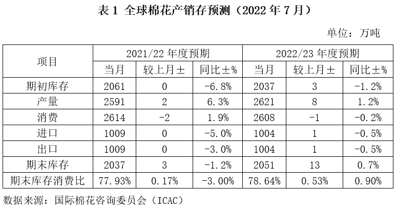 2022年7月國(guó)際棉花咨詢委員會(huì)(ICAC)發(fā)布2022年度全球棉花產(chǎn)銷存預(yù)測(cè)數(shù)據(jù)顯示,2022年度全球棉花產(chǎn)量2621萬(wàn)噸,環(huán)比調(diào)增0.3%,同比增加1.2%,消費(fèi)量2608萬(wàn)噸,環(huán)比基本持平,同比下降0.2%,產(chǎn)大于需13萬(wàn)噸,期末庫(kù)存消費(fèi)比78.64%,環(huán)比調(diào)增0.53個(gè)百分點(diǎn),同比上升0.72個(gè)百分點(diǎn)。當(dāng)前北半球棉花生長(zhǎng)進(jìn)入后期,如果后續(xù)不發(fā)生大的災(zāi)害天氣,全球產(chǎn)量增加基本明確,消費(fèi)端面臨疫情松綁和經(jīng)濟(jì)增速放緩、通脹擠壓、貿(mào)易壁壘等多重復(fù)雜局面,全球棉花供求關(guān)系趨于寬松。
