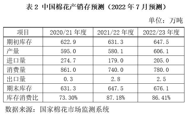 本期將2022年度中國(guó)棉花產(chǎn)量上調(diào)22.8萬(wàn)噸至606.1萬(wàn)噸,同比增加26萬(wàn)噸,增幅4.5%;棉花消費(fèi)量維持上期的780萬(wàn)噸,同比增加40萬(wàn)噸,增幅5.4%,進(jìn)口量維持上期的205萬(wàn)噸,同比增加26萬(wàn)噸,增幅14.5%,庫(kù)存消費(fèi)比為86.41%,較上年度下降0.77個(gè)百分點(diǎn)。