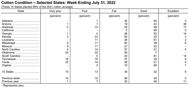 美國農(nóng)業(yè)部8月1日發(fā)布的美國棉花生長報(bào)告顯示,截至7月31日當(dāng)周,美棉現(xiàn)蕾率為89%,前周為80%,去年同期為81%,五年均值為87%。美棉結(jié)鈴率為58%,前周為48%,去年同期為48%,五年均值為50%。美棉生長優(yōu)良率為34%,前周為34%,去年同期為60%。