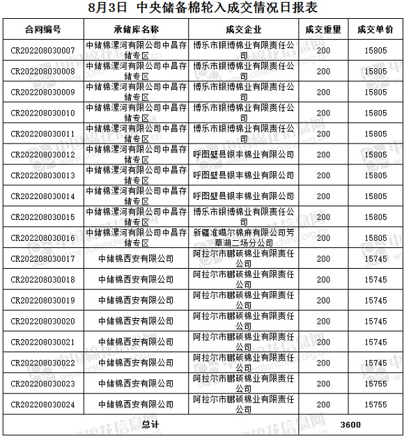 8月3日,中國(guó)儲(chǔ)備棉管理有限公司掛牌采購(gòu)棉花6000噸(公定重量),實(shí)際成交3600噸,成交率60%,成交均價(jià)15779元/噸,成交最高價(jià)15805元/噸,成交最低價(jià)15745元/噸。