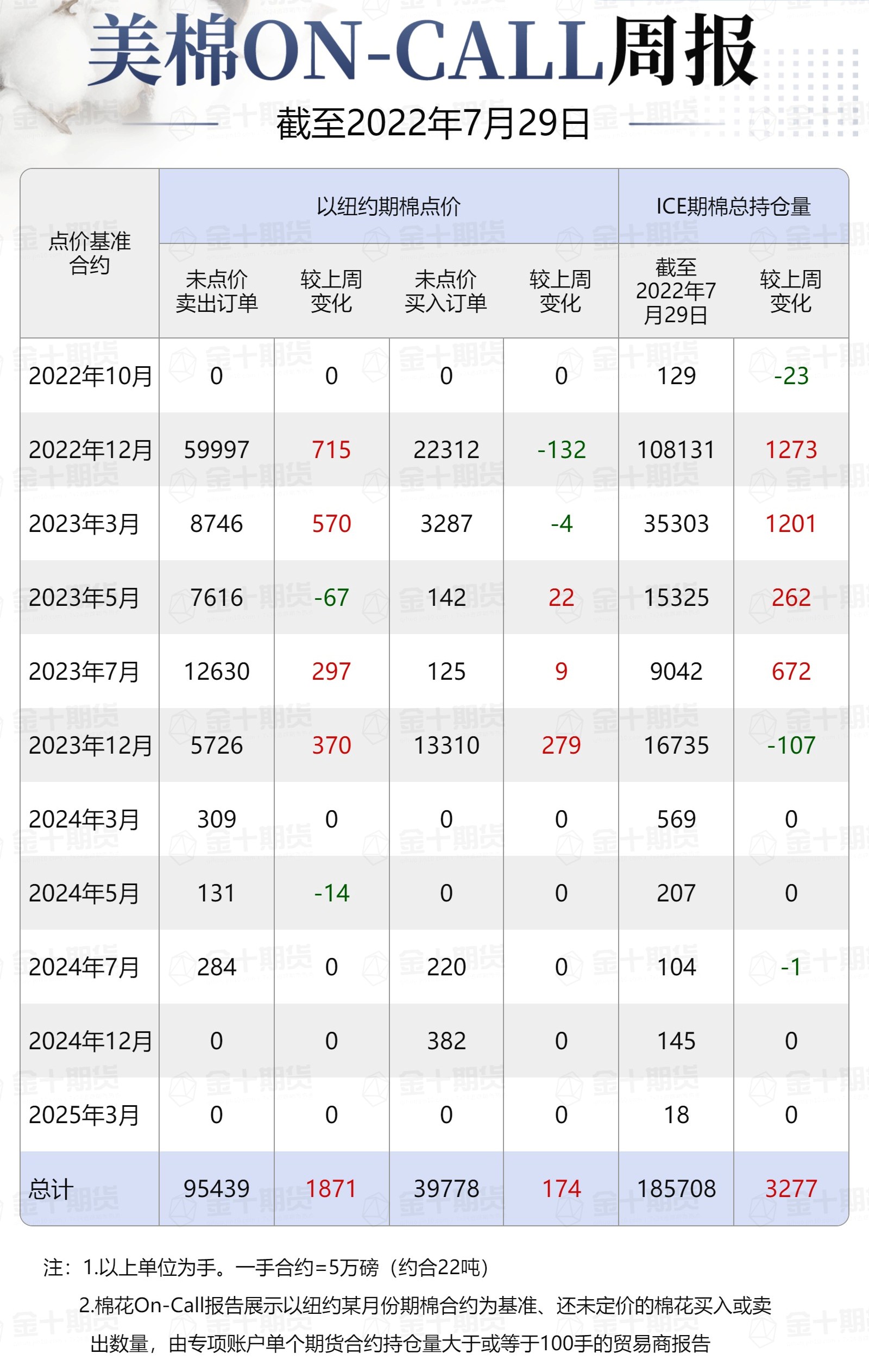 據(jù)美國商品期貨交易委員會(CFTC)最新數(shù)據(jù),截至7月29日,①美棉On-Call未點價賣出訂單95439手,環(huán)比增加1871手;未點價買入訂單39778手,環(huán)比增加174手;②ICE期棉202210合約上賣方未點價合約為0手,較此前一周增加0手;③ICE期棉202212合約上賣方未點價合約為59997手,較此前一周增加715手;④ICE期棉2303合約上賣方未點價合約為8746手,較此前一周增加570手;⑤ICE期棉2305合約上賣方未點價合約為7616手,較此前一周減少67手;⑥ICE期棉2307合約上賣方未點價合約為12630手,較此前一周增加297手;⑦ICE棉花期貨盤面2022/23年度(8月至次年7月)的On-Call合約未點價賣出訂單為88989手,環(huán)比增加1515手。