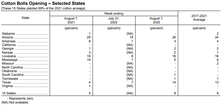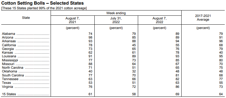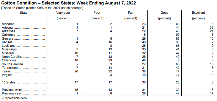 美國農(nóng)業(yè)部8月8日發(fā)布的美國棉花生長報(bào)告顯示,截至8月7日當(dāng)周,美棉現(xiàn)蕾率為95%,前周為89%,去年同期為87%,五年均值為93%。美棉結(jié)鈴率為69%,前周為58%,去年同期為61%,五年均值為64%。美棉盛鈴率為9%,去年同期為5%,五年均值為9%。美棉生長優(yōu)良率為31%,前周為38%,去年同期為65%。