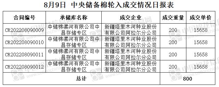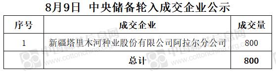 8月9日,中國儲備棉管理有限公司掛牌采購棉花6000噸(公定重量),實(shí)際成交800噸,成交率13%,成交均價15658元/噸,成交最高價15658元/噸,成交最低價15658元/噸。