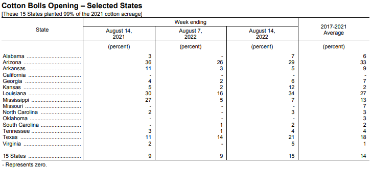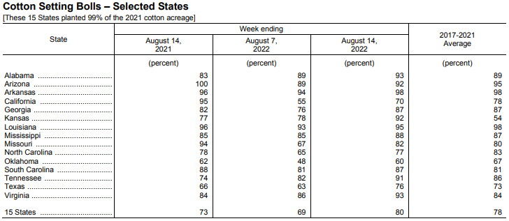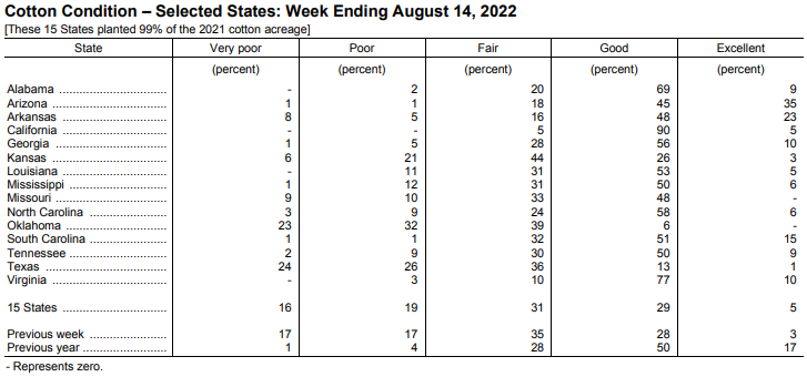 美國(guó)農(nóng)業(yè)部8月15日發(fā)布的美國(guó)棉花生長(zhǎng)報(bào)告顯示,截至8月14日當(dāng)周,美棉結(jié)鈴率為80%,前周為69%,去年同期為73%,五年均值為78%。美棉盛鈴率為15%,前周為9%,去年同期為9%,五年均值為14%。美棉生長(zhǎng)優(yōu)良率為34%,前周為31%,去年同期為67%。