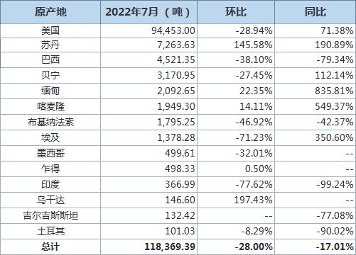 據(jù)海關(guān)統(tǒng)計(jì)數(shù)據(jù),2022年7月我國(guó)進(jìn)口棉花約12萬(wàn)噸,環(huán)比減少約4萬(wàn)噸,同比下降約17.0%。