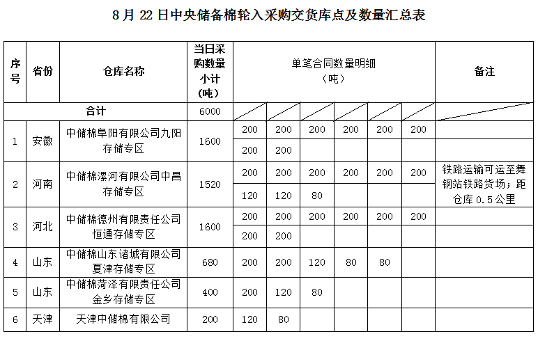 中國儲備棉管理有限公司定于2022年8月22日采購棉花6000噸(公定重量)。具體庫點及數(shù)量如下: