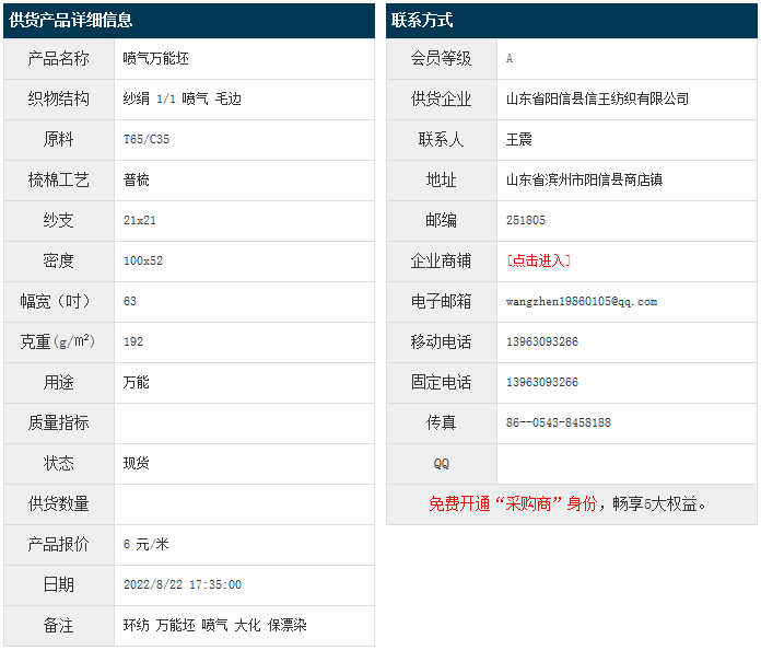8月22日,山東陽(yáng)信縣信王紡織有限公司大化滌棉紗絹T65/C35 21x21 100x52 63" 1/1 192g/㎡ 噴氣 毛邊,報(bào)價(jià)為6元/米,實(shí)際成交價(jià)以協(xié)商為準(zhǔn)。[點(diǎn)擊查看詳情]