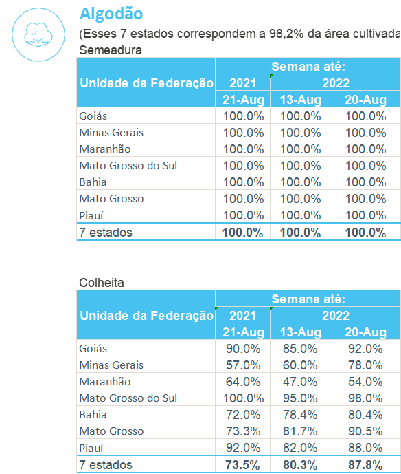 據(jù)巴西農(nóng)業(yè)部下屬的國家商品供應(yīng)公司CONAB,截至8月20日,巴西棉花收割率為87.8%,上周為80.3%,去年同期為73.5%。