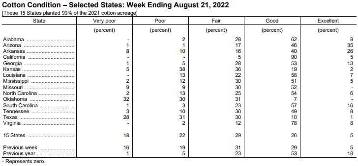 美國農(nóng)業(yè)部8月22日發(fā)布的美國棉花生長報告顯示,截至8月21日當(dāng)周,美棉結(jié)鈴率為88%,前周為80%,去年同期為78%,五年均值為85%。美棉盛鈴率為19%,前周為15%,去年同期為13%,五年均值為18%。美棉生長優(yōu)良率為31%,前周為34%,去年同期為71%。