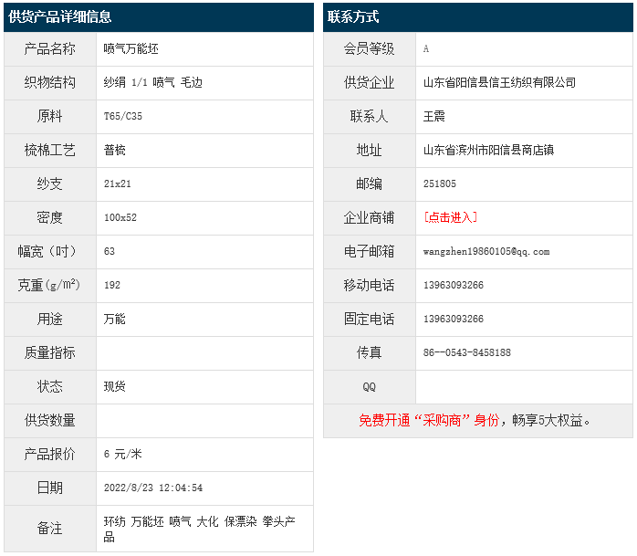 8月23日,山東陽信縣信王紡織有限公司大化滌棉紗絹T65/C35 21x21 100x52 63" 1/1 192g/㎡ 噴氣 毛邊,報(bào)價(jià)為6元/米,實(shí)際成交價(jià)以協(xié)商為準(zhǔn)。[點(diǎn)擊查看詳情]