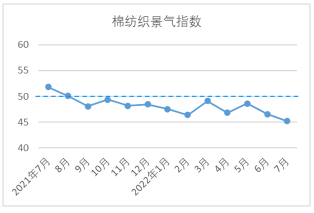 7月,企業(yè)信心指數(shù)為45.33,較6月上升1.44,位于枯榮線下方。當(dāng)前,世界經(jīng)濟(jì)下行風(fēng)險(xiǎn)加大,國(guó)際貨幣基金組織連續(xù)下調(diào)全球經(jīng)濟(jì)增長(zhǎng)預(yù)期,同時(shí)國(guó)際糧食和能源供應(yīng)相對(duì)緊張,外部環(huán)境的不確定性和不穩(wěn)定性在上升。國(guó)內(nèi)經(jīng)濟(jì)目前還是處在恢復(fù)進(jìn)程中,內(nèi)外需求依舊弱勢(shì),市場(chǎng)消費(fèi)信心和動(dòng)力不足。臨近新棉上市,供應(yīng)端壓力不減,隨著“金九銀十”即將到來(lái),企業(yè)對(duì)傳統(tǒng)紡織旺季抱有一定期待。