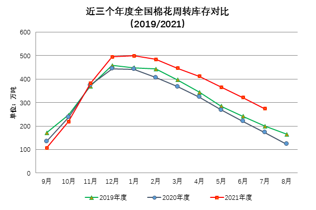 7月,全國棉花市場資源供應(yīng)充足,國內(nèi)棉價延續(xù)弱勢下跌,棉企銷售壓力加大,紛紛低價促銷。紡織廠淡季持續(xù),下游需求依然較弱,部分企業(yè)逢低按需適量補庫,月內(nèi)儲備棉輪入啟動,國內(nèi)棉花周轉(zhuǎn)庫存繼續(xù)減少,且仍高于去年同期。據(jù)中國棉花協(xié)會棉花物流分會對全國棉花交易市場18個省市的154家棉花交割和監(jiān)管倉庫的調(diào)查數(shù)據(jù)顯示,7月底全國棉花周轉(zhuǎn)庫存總量約273.61萬噸,環(huán)比減少48萬噸,降幅14.92%,高于去年同期100.51萬噸。