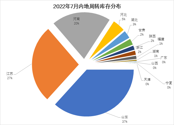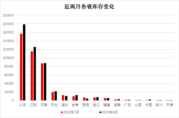 7月,國內(nèi)棉花現(xiàn)貨價格弱勢大幅下跌,紡織廠逢低適量補庫,內(nèi)地周轉(zhuǎn)庫存有所減少。具體為:7月內(nèi)地周轉(zhuǎn)庫存為42.58萬噸,環(huán)比減少3.64萬噸。其中新疆棉34.82萬噸,已通關(guān)進口棉3.66萬噸,地產(chǎn)棉4.1萬噸。分省份看,山東省庫存量居首位為15.64萬噸,江蘇省次之為11.50萬噸,河南省居第三位為8.73萬噸,河北省為1.94萬噸,湖北省為1.23萬噸,其他省均在1萬噸以下。
