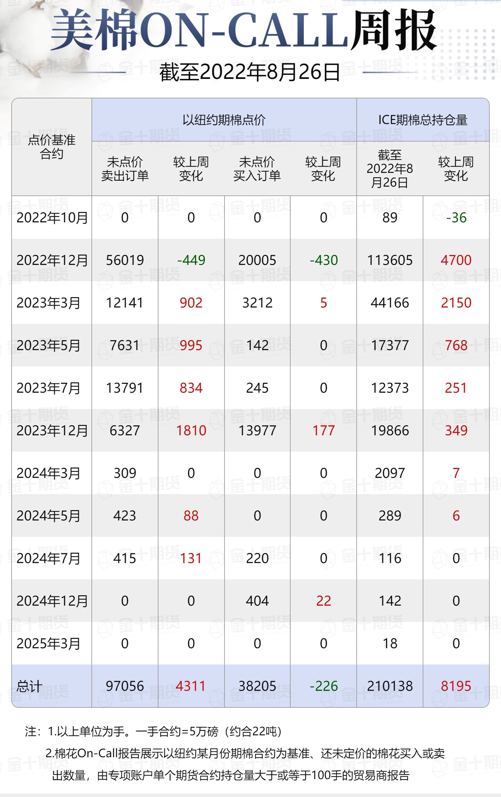 據(jù)美國(guó)商品期貨交易委員會(huì)(CFTC)最新數(shù)據(jù),截至8月26日,①美棉On-Call未點(diǎn)價(jià)賣(mài)出訂單97056手,環(huán)比增加4311手;未點(diǎn)價(jià)買(mǎi)入訂單38205手,環(huán)比減少226手;②ICE期棉2210合約上賣(mài)方未點(diǎn)價(jià)合約為0手,較此前一周增加0手;③ICE期棉2212合約上賣(mài)方未點(diǎn)價(jià)合約為56019手,較此前一周減少449手;④ICE期棉2303合約上賣(mài)方未點(diǎn)價(jià)合約為12141手,較此前一周增加902手;⑤ICE期棉2305合約上賣(mài)方未點(diǎn)價(jià)合約為7631手,較此前一周增加995手;⑥ICE期棉2307合約上賣(mài)方未點(diǎn)價(jià)合約為13791手,較此前一周增加834手;⑦ICE棉花期貨盤(pán)面2022/23年度(8月至次年7月)的On-Call合約未點(diǎn)價(jià)賣(mài)出訂單為89582手,環(huán)比增加2282手。