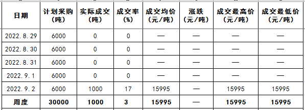 2022年8月29日至9月2日是2022年中央儲(chǔ)備棉輪入第八周,中國(guó)儲(chǔ)備棉管理有限公司掛牌采購(gòu)30000噸,實(shí)際成交1000噸,成交率3%,成交均價(jià)15995元/噸,成交最高價(jià)15995元/噸,成交最低價(jià)15995元/噸。