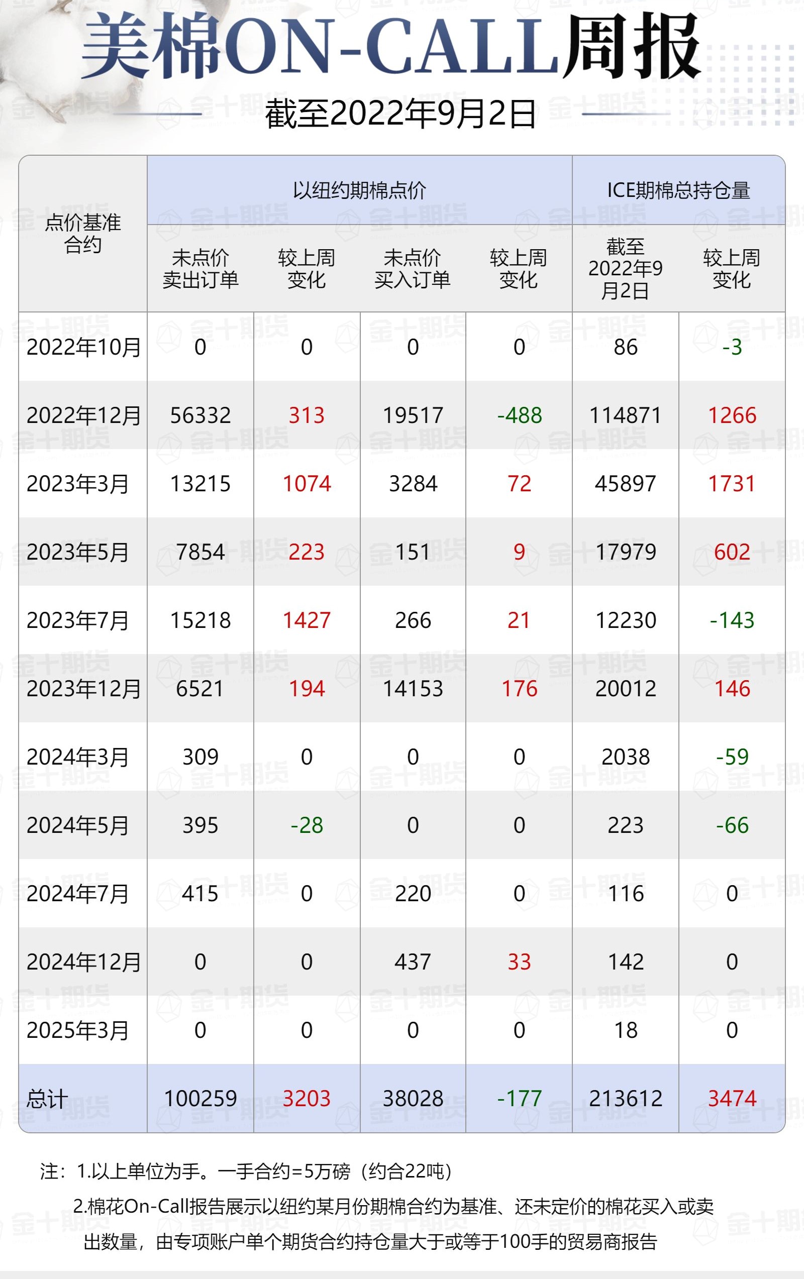 據(jù)美國商品期貨交易委員會(CFTC)最新數(shù)據(jù),截至9月2日,①美棉On-Call未點價賣出訂單100259手,環(huán)比增加3203手;未點價買入訂單38028手,環(huán)比減少177手;②ICE期棉2210合約上賣方未點價合約為0手,較此前一周增加0手;③ICE期棉2212合約上賣方未點價合約為56332手,較此前一周增加313手;④ICE期棉2303合約上賣方未點價合約為13215手,較此前一周增加1074手;⑤ICE期棉2305合約上賣方未點價合約為7854手,較此前一周增加223手;⑥ICE期棉2307合約上賣方未點價合約為15218手,較此前一周增加1427手;⑦ICE棉花期貨盤面2022/23年度(8月至次年7月)的On-Call合約未點價賣出訂單為92619手,環(huán)比增加3037手。