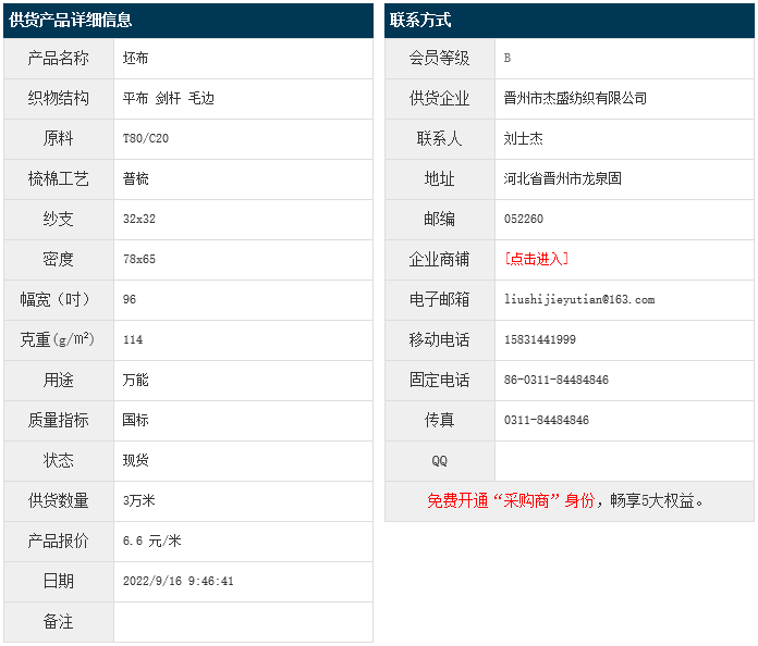 9月16日,晉州杰盛紡織有限公司滌棉平布T80/C20 32x32 78x65 96" 114g/㎡ 劍桿 毛邊,報價為6.6元/米,實際成交價以協商為準。[點擊查看詳情]