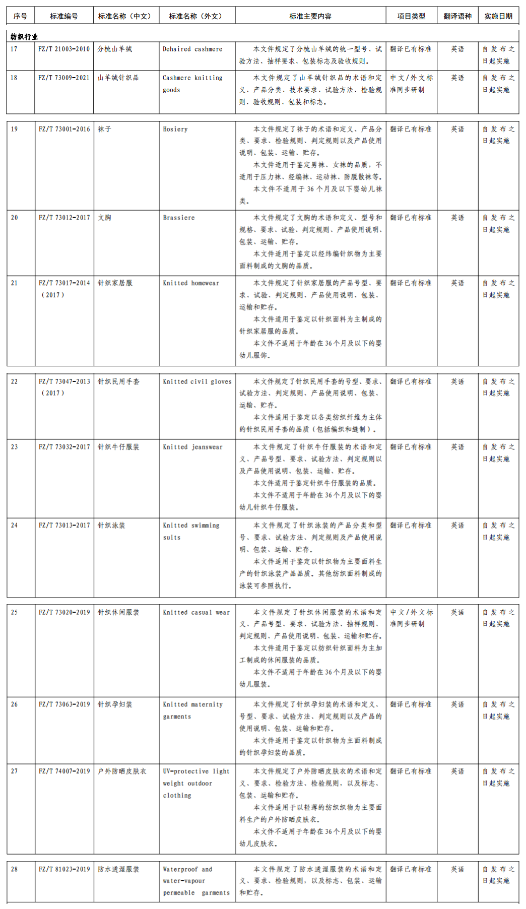 2項紡織行業(yè)標準編號、名稱、主要內(nèi)容等一覽表