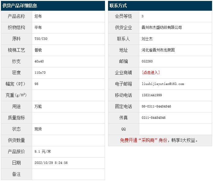 10月29日,晉州杰盛紡織有限公司滌棉平布T50/C50 40x40 110x70 98",報價為9.1元/米,實際成交價以協(xié)商為準。[點擊查看詳情]