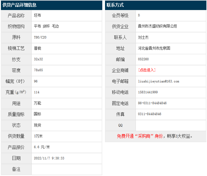 11月7日,晉州杰盛紡織有限公司滌棉平布T80/C20 32x32 78x65 96" 114g/㎡ 劍桿 毛邊,報價為6.6元/米,實(shí)際成交價以協(xié)商為準(zhǔn)。[點(diǎn)擊查看詳情]