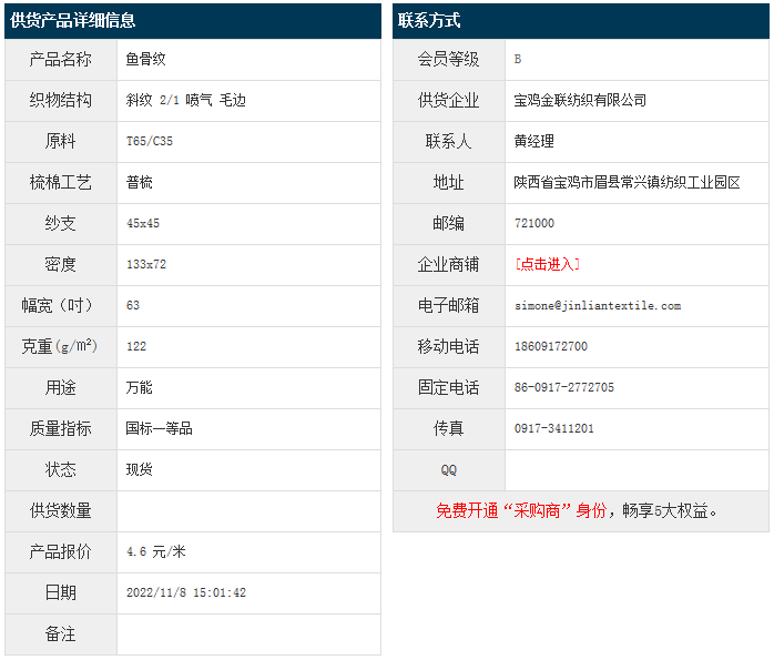 11月8日,寶雞金聯(lián)紡織有限公司滌棉魚骨紋T65/C35 45x45 133x72 63" 斜紋2/1 122g/㎡ 噴氣 毛邊,報價為4.6元/米,實際成交價以協(xié)商為準(zhǔn)。[點擊查看詳情]