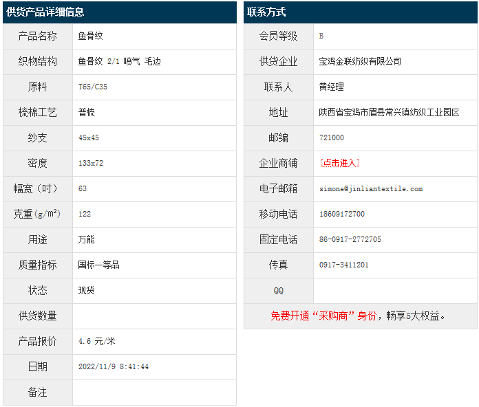 11月9日,寶雞金聯(lián)紡織有限公司滌棉魚骨紋T65/C35 45x45 133x72 63" 2/1 122g/㎡ 噴氣 毛邊,報價為4.6元/米,實際成交價以協(xié)商為準(zhǔn)。[點擊查看詳情]