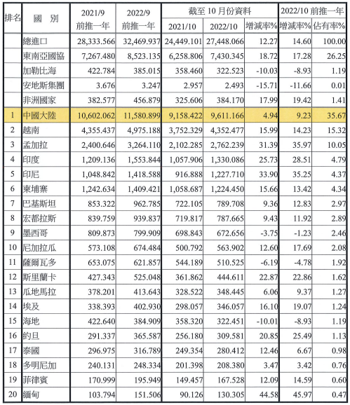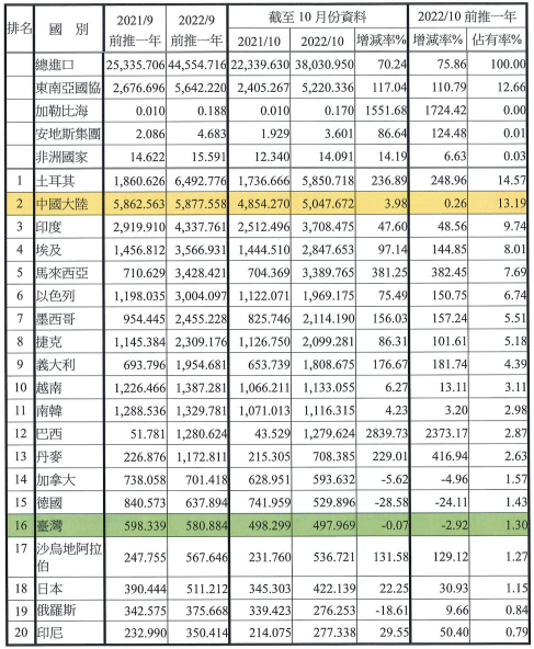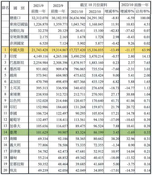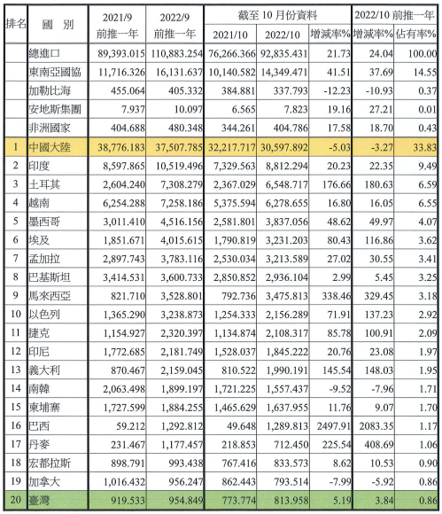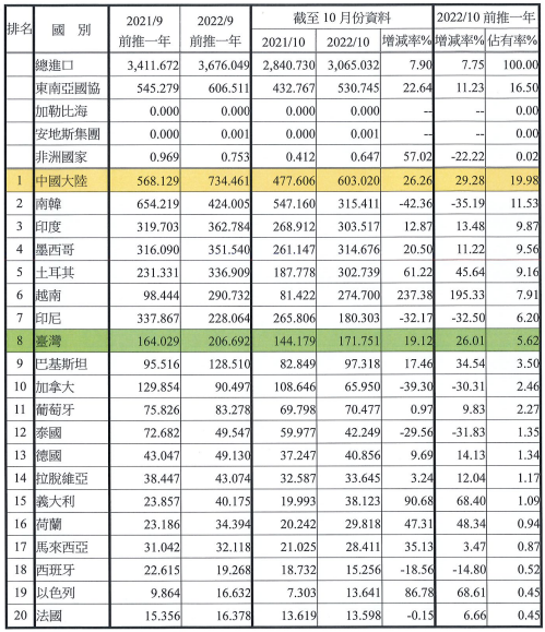 注:依2022年10月前推一年進口占有率排序