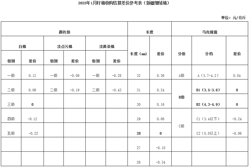 根據(jù)《中國棉花協(xié)會籽棉收購結(jié)算差價參考表(新疆細(xì)絨棉)管理辦法》規(guī)定,現(xiàn)正式發(fā)布2023年1月《籽棉收購結(jié)算差價參考表(新疆細(xì)絨棉)》(單位:元/公斤),為新疆地區(qū)籽棉收購工作提供參考。