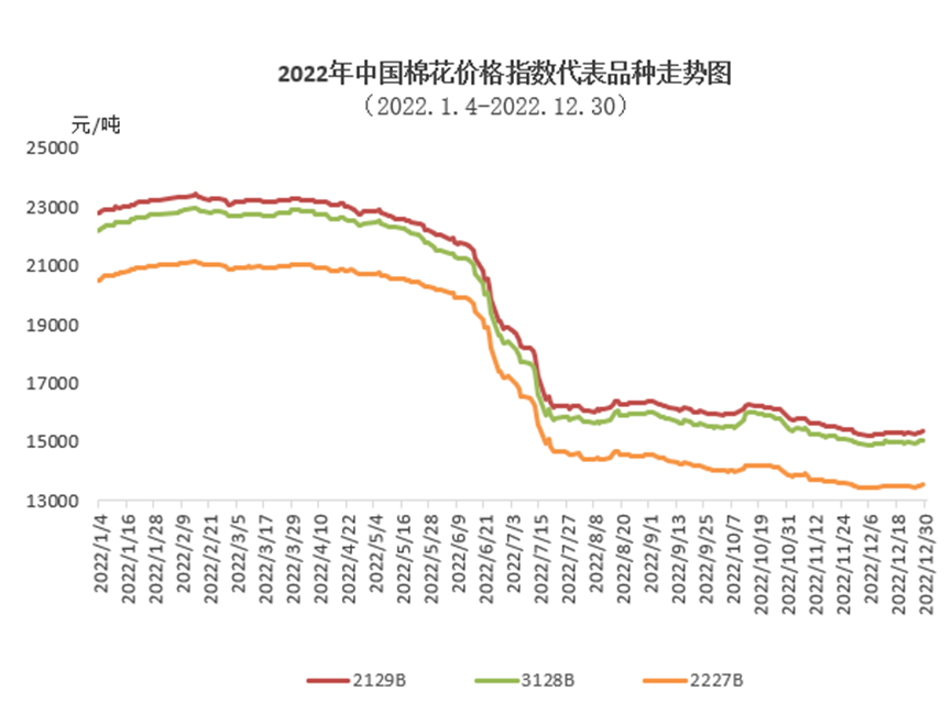 12月,國內疫情防控政策進一步優(yōu)化,月中下旬疫情高峰過后,市場信心有所提振,國內鄭棉持續(xù)反彈,主力合約最高漲至近3個月高位;棉企積極銷售,疆棉出疆量大幅增加,月中下旬受期貨上漲帶動現(xiàn)貨價格逐漸上漲,同時,臨近年底紡織廠有傳統(tǒng)備貨需求,市場購銷進度月中下旬好于月初,國內棉價指數(shù)先跌后漲,但月均價較上月仍有下跌。月末,中國棉花價格指數(shù)(CCIndex3128B)15046元/噸,環(huán)比上漲73元;月均價14970元/噸,環(huán)比下跌259元,同比下跌6988元。